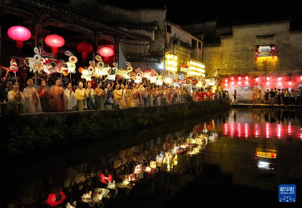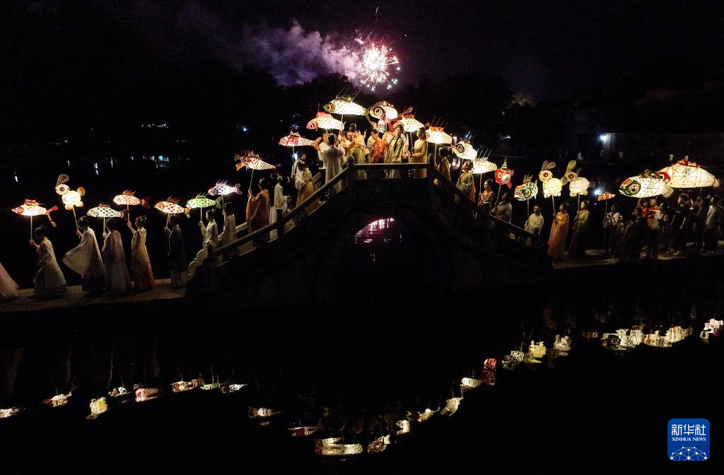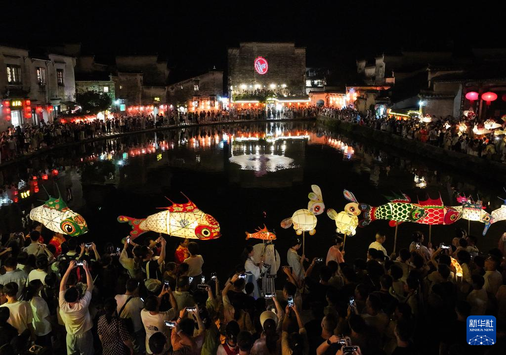 9月15日,花燈表演隊伍在安徽省黃山市黟縣宏村巡游(無人機照片)。