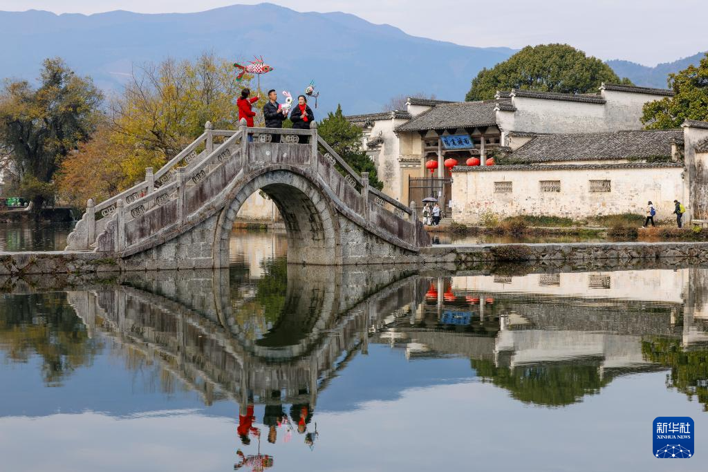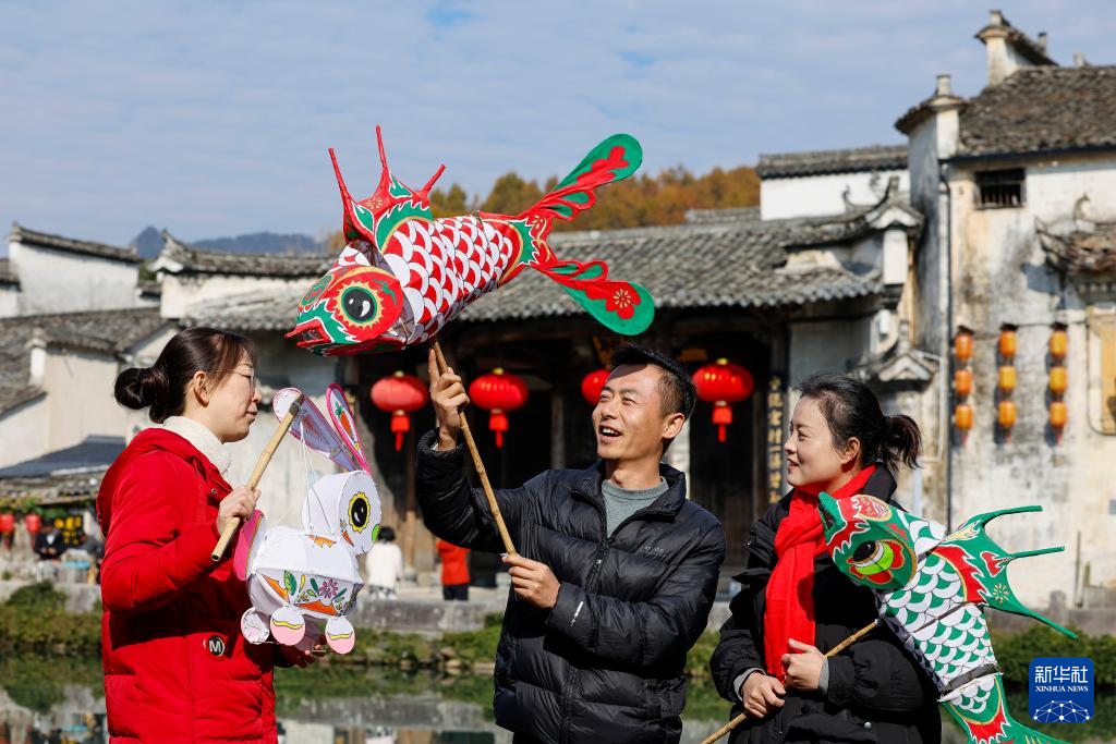 12月9日,在安徽省黃山市黟縣宏村,何繼星(中)和學員在查看花燈。