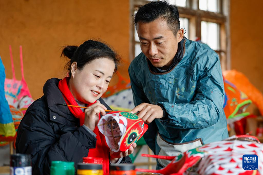 12月9日,在安徽省黃山市黟縣宏村,何繼星(左)在指導學員制作花燈。