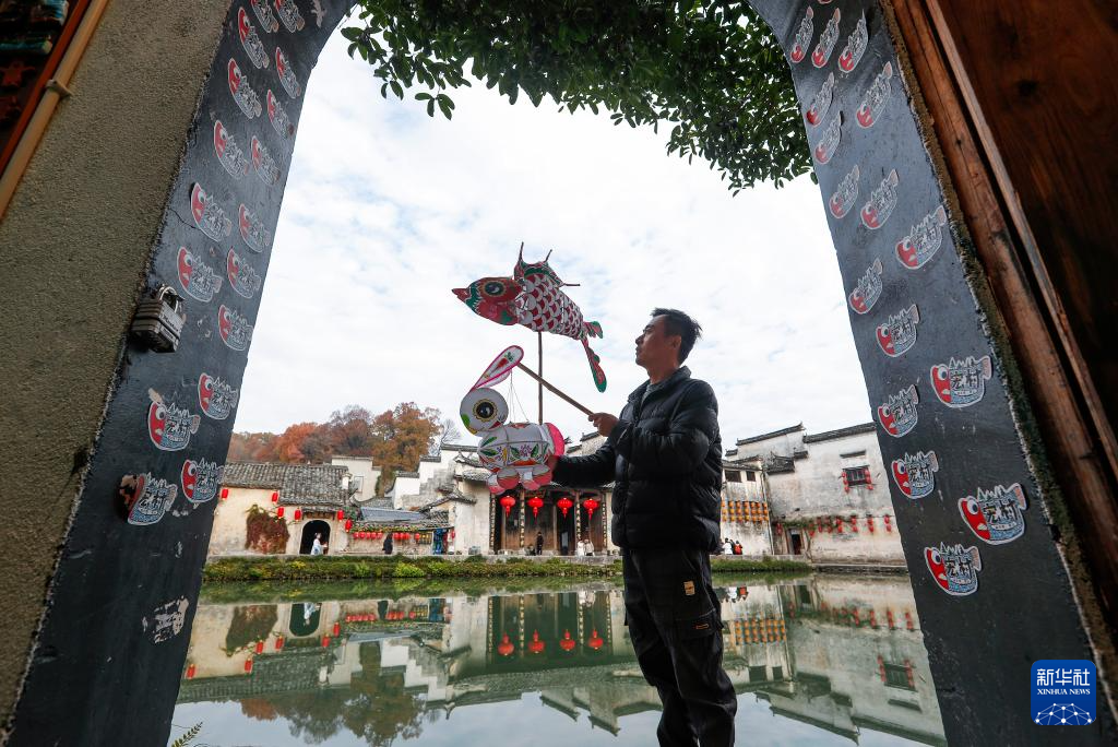12月9日,在安徽省黃山市黟縣宏村,何繼星在查看花燈。