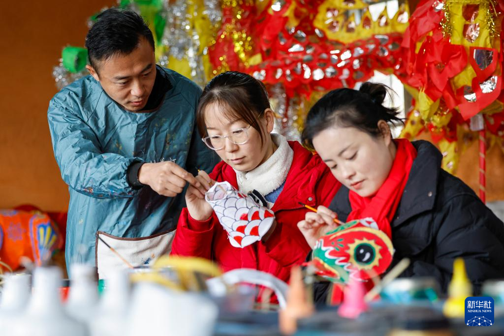 12月9日,在安徽省黃山市黟縣宏村,何繼星(右)指導學員制作花燈。