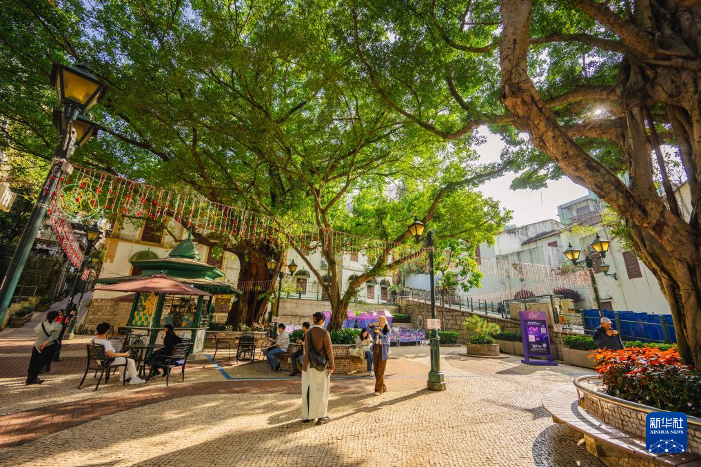 12月12日,游客在澳門議事亭前地的圣誕樹前拍照。