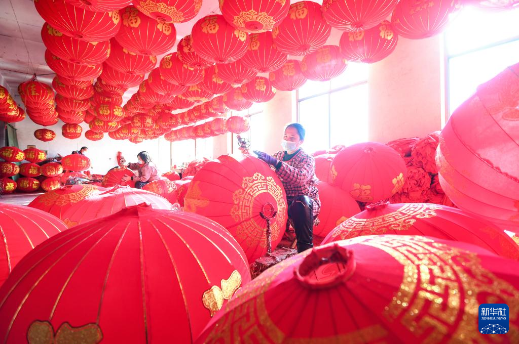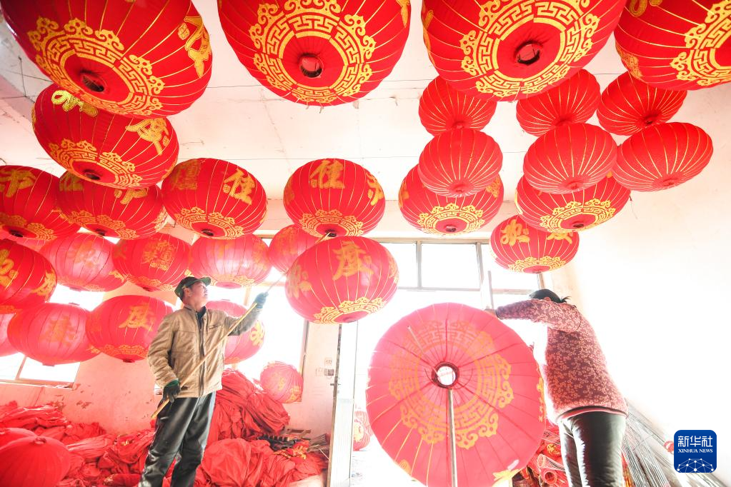 12月16日,在河北省石家莊市藁城區屯頭村一家宮燈廠,村民們在制作宮燈。