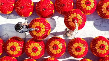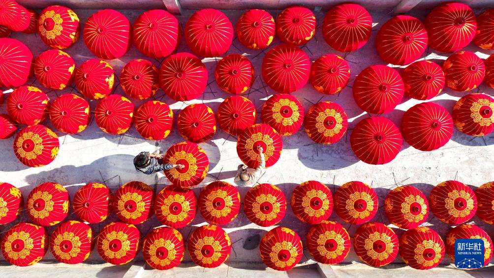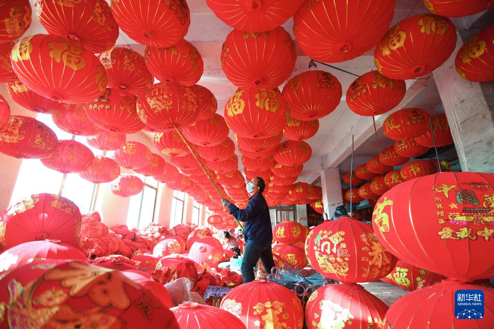 12月16日,在河北省石家莊市藁城區梅花鎮屯頭村一家宮燈生產廠,工人在晾曬宮燈。