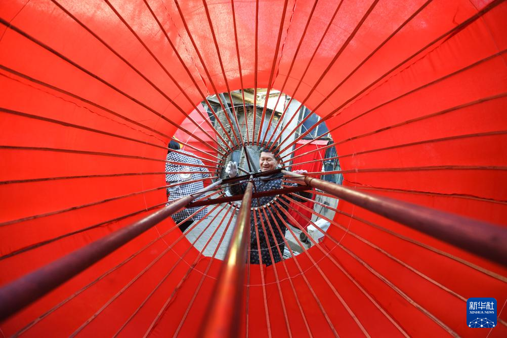 12月16日,在河北省石家莊市藁城區屯頭村一家宮燈廠,宮燈藝人在制作大型宮燈。