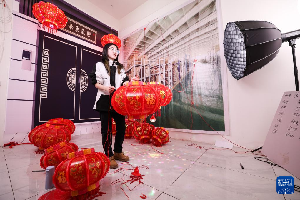 12月16日,在河北省石家莊市藁城區梅花鎮屯頭村宮燈直播基地,工作人員通過直播方式銷售宮燈。
