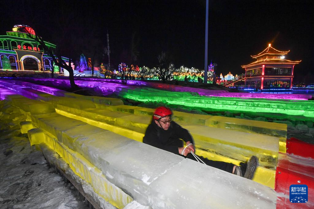 12月17日,游客在長春冰雪新天地體驗冰滑梯。