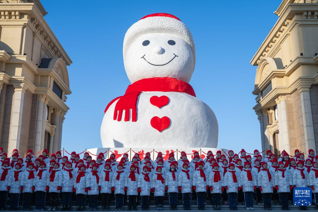 12月17日,小學生在哈爾濱松花江畔的大雪人前表演。