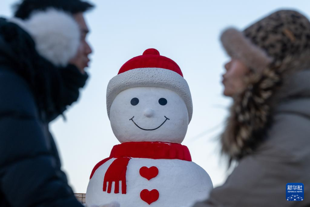 12月17日,游客在哈爾濱松花江畔的大雪人前游覽。