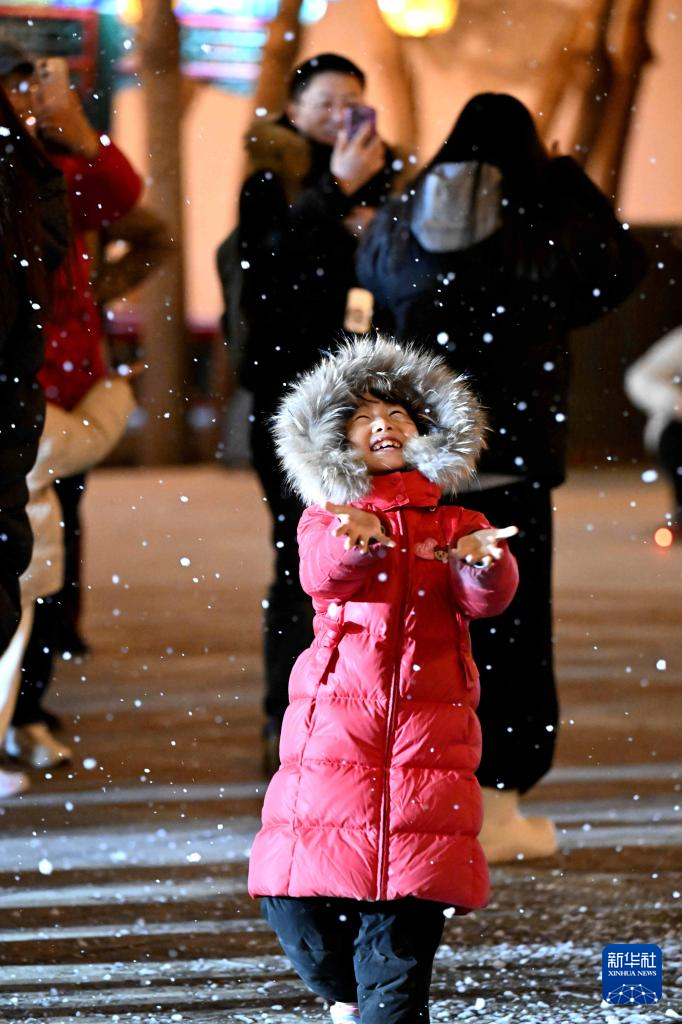 12月18日晚,一名小朋友在正定縣榮國府影視基地體驗冬雪情景。
