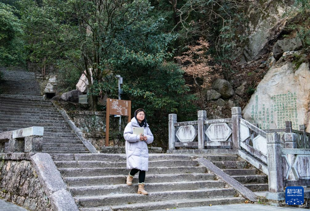 12月18日,黃山風景區文化事業管理辦公室工作人員章靜茹在巡查摩崖石刻情況。