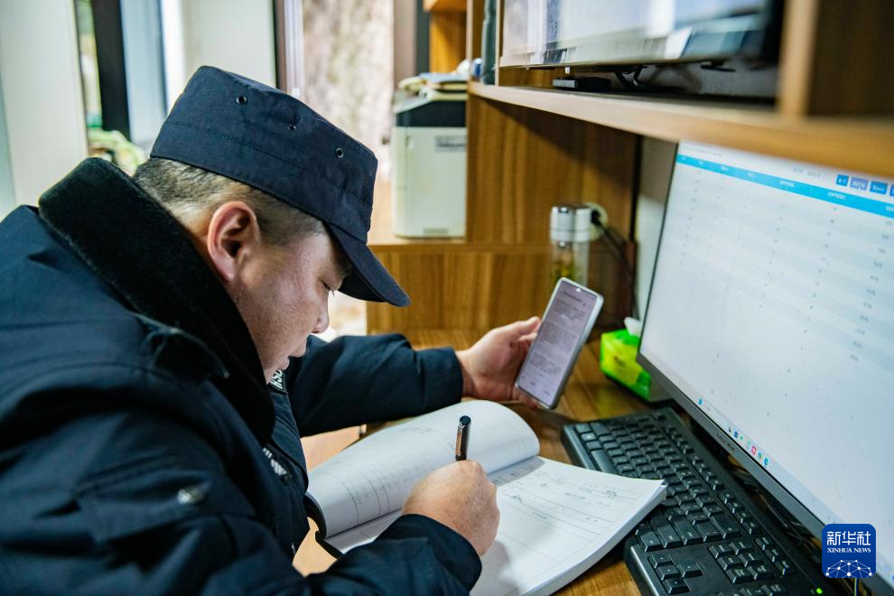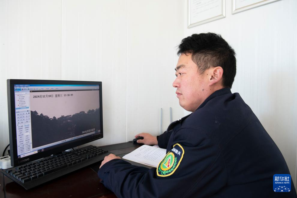 12月18日,黃山風景區管委會園林局瞭望哨防火小隊隊長秦志平在平天矼瞭望哨內查看森林防火視頻監控。