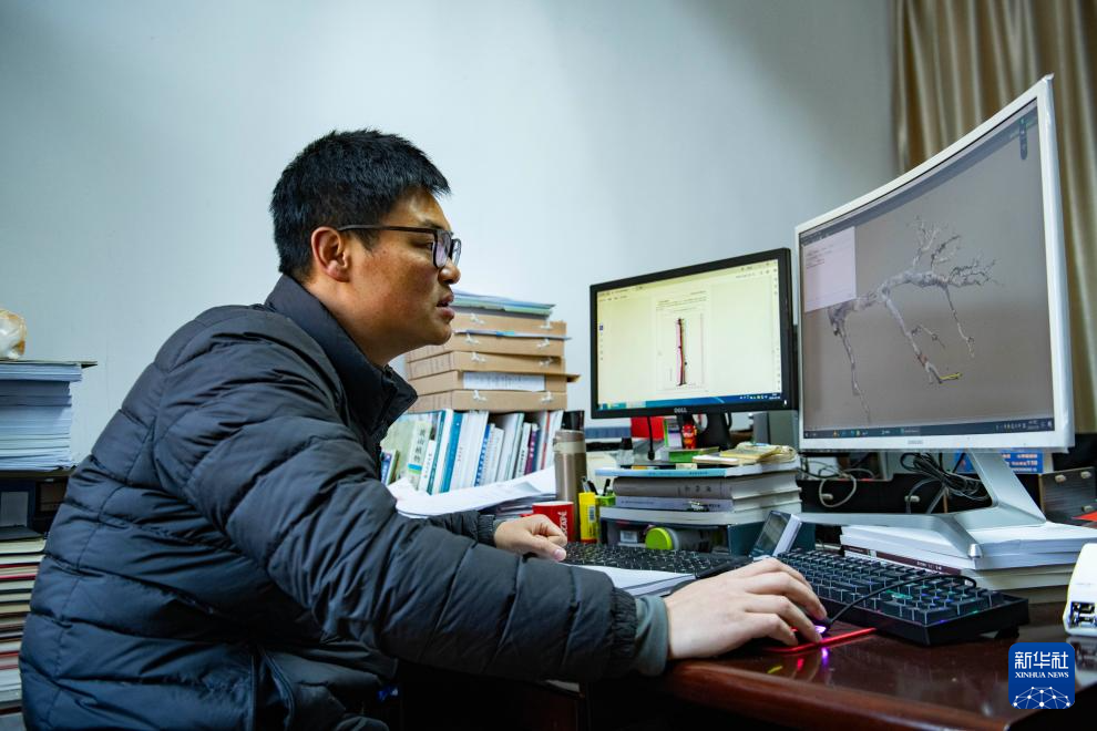 12月18日,黃山風景區管委會園林局高級工程師吳貽軍在辦公室里查看迎客松本體3D數字模型。