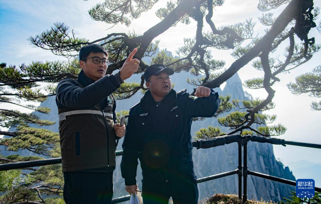 12月18日,“守松人”胡曉春(右)和黃山風景區管委會園林局高級工程師吳貽軍討論迎客松生長情況。