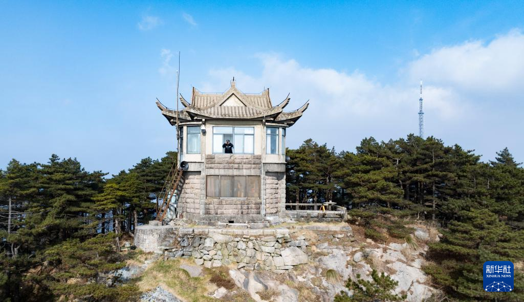 12月18日,黃山風景區管委會園林局瞭望哨防火小隊隊長秦志平在平天矼瞭望哨用望遠鏡觀察遠處情況(無人機照片)。