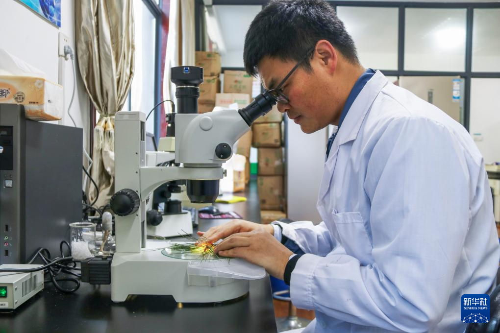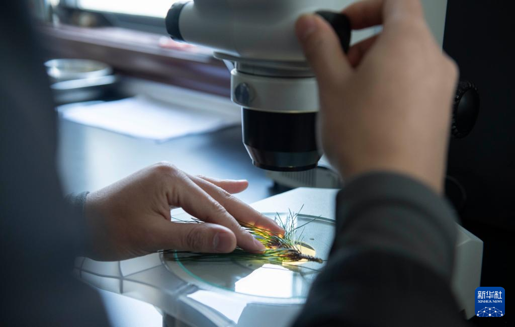 12月20日,黃山風景區管委會園林局高級工程師吳貽軍在檢驗檢疫室里觀察松針樣本。