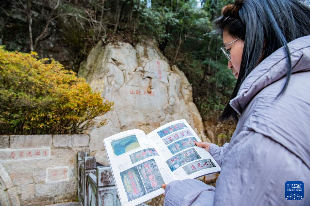 12月18日,黃山風景區文化事業管理辦公室工作人員章靜茹對照《黃山摩崖石刻》書籍查看摩崖石刻。