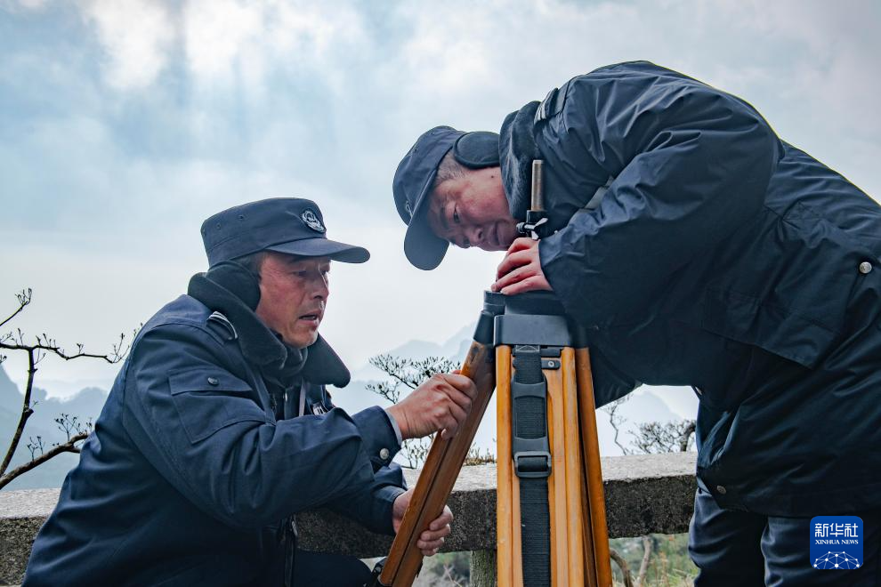 12月18日,黃山風景區管委會園林局瞭望哨防火小隊隊長秦志平(右)和同事在平天矼瞭望哨外組裝望遠鏡。