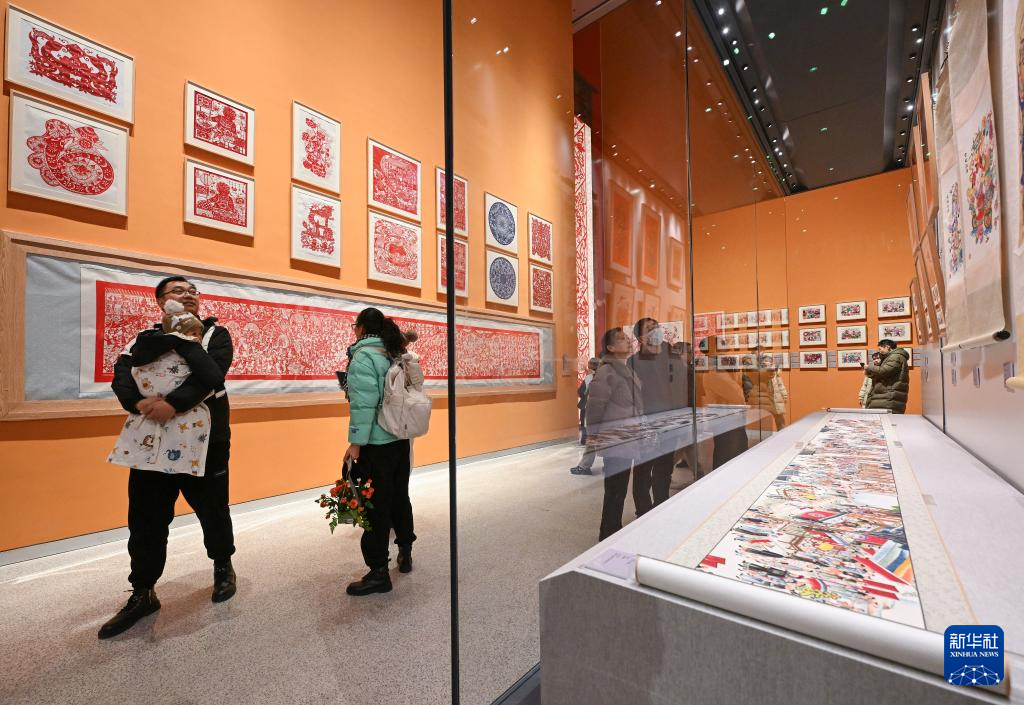 12月21日,觀眾在展廳內參觀剪紙、年畫等非遺展品。