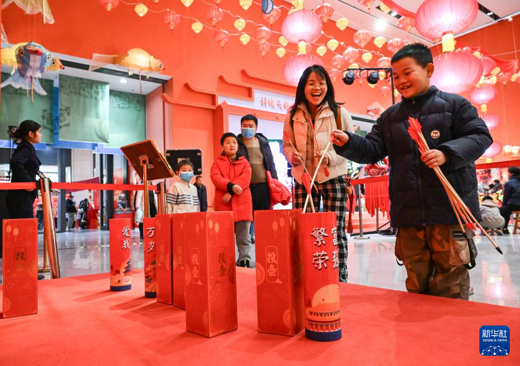 12月21日,觀眾在展廳內互動體驗傳統節日項目——投壺。