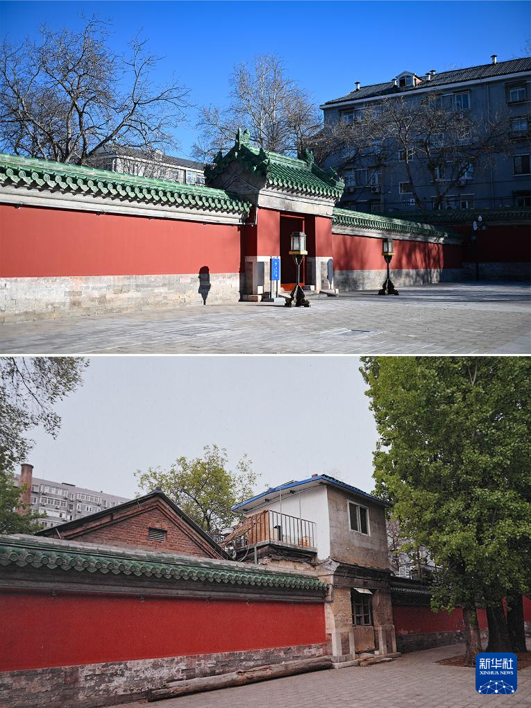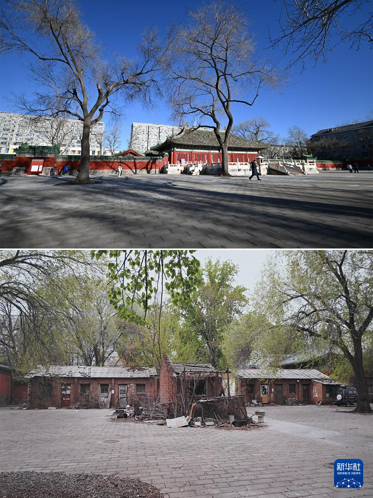 拼版照片:上圖為騰退修繕后的慶成宮正殿東側區域;下圖為翻拍的慶成宮正殿東側區域騰退修繕前的資料照片(12月21日攝)。