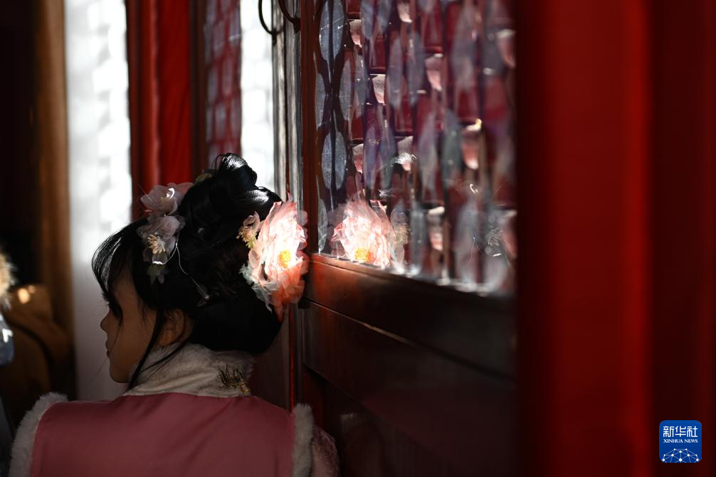 12月21日冬至日,陽光穿過慶成宮正殿的窗花,照亮一名女士的頭花。