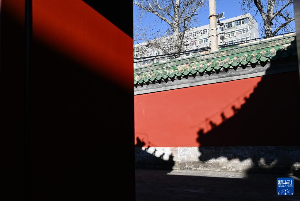 12月21日冬至日,陽光在紅墻上照射出慶成宮屋頂和脊獸的影子。