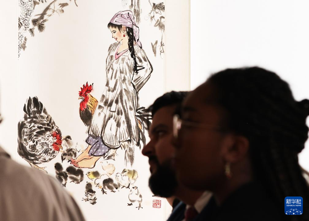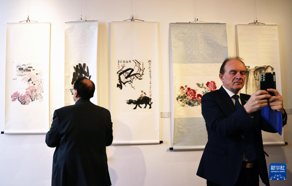 12月20日,在法國巴黎中國文化中心,嘉賓在“心境映象——榮寶齋當代藝術展暨木版水印特展”上參觀。