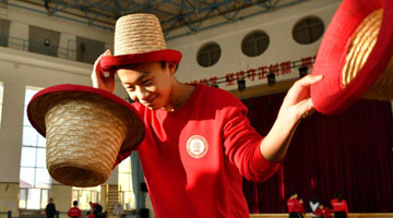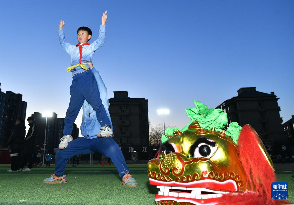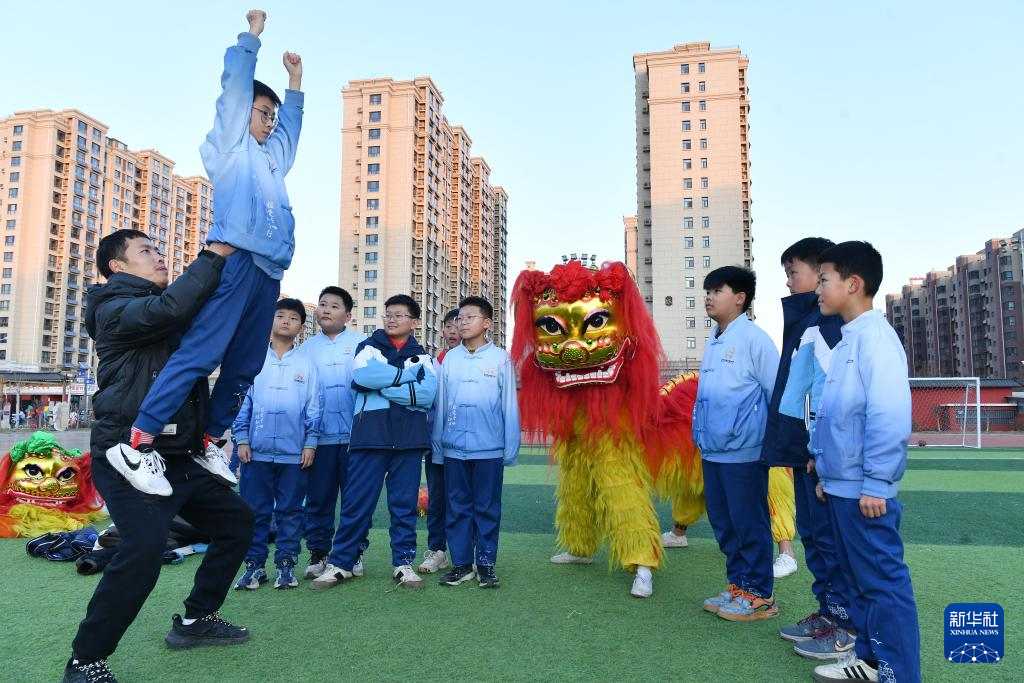12月20日,河北省滄州市重慶路小學舞龍舞獅社團的學生們在舞獅藝人的指導下學習舞獅動作。