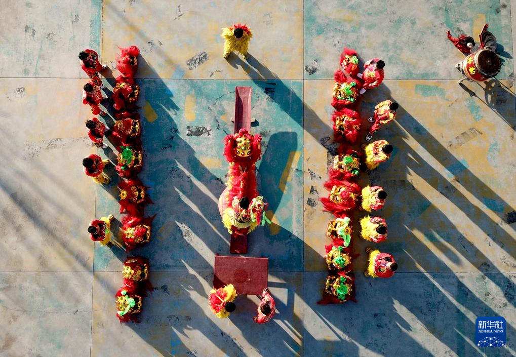 12月20日,河北省滄州市滄縣神韻舞獅傳承基地的學員們在進行獅子滾繡球訓練(無人機照片)。