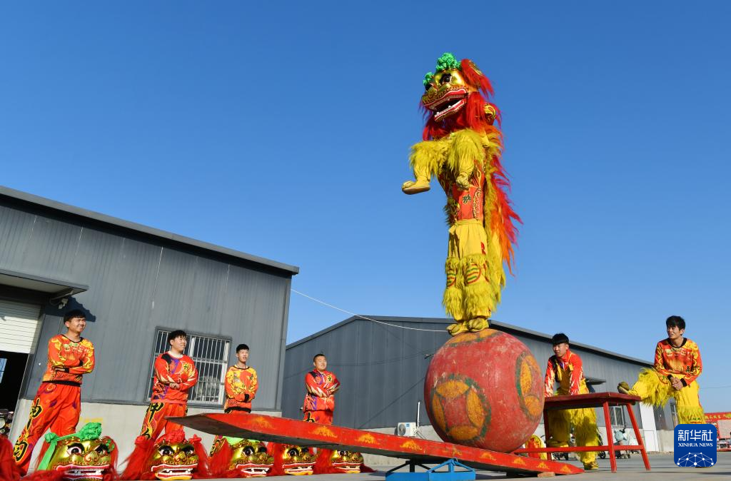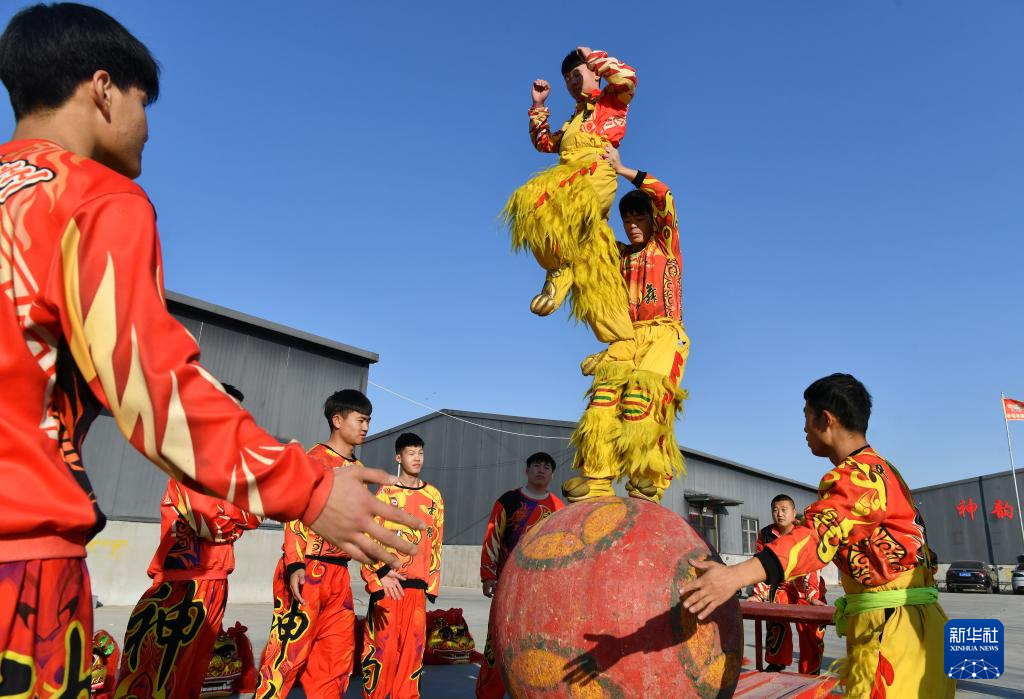 12月20日,河北省滄州市滄縣神韻舞獅傳承基地的學員們在進行獅子滾繡球訓練。