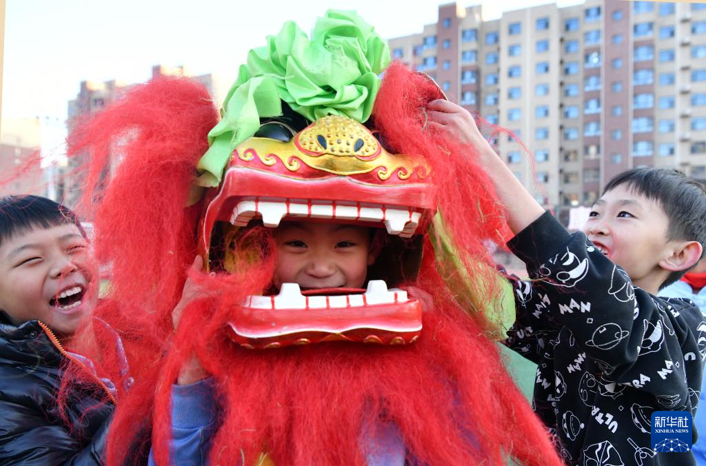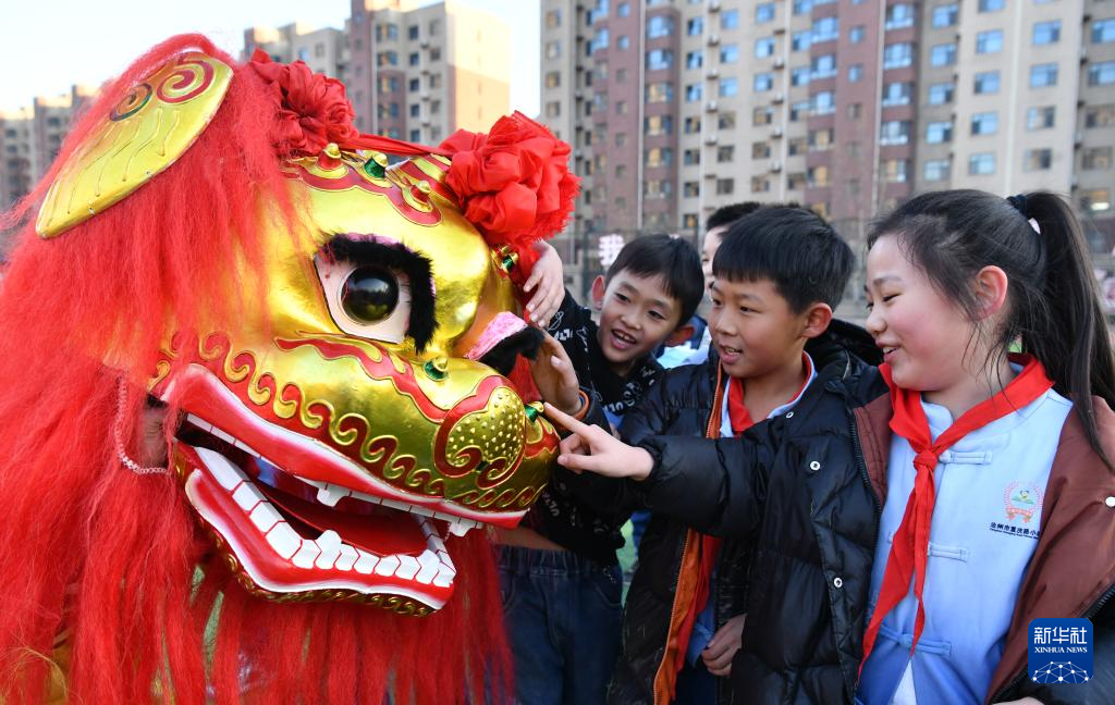 12月20日,河北省滄州市重慶路小學舞龍舞獅社團的學生在與舞獅藝人互動。