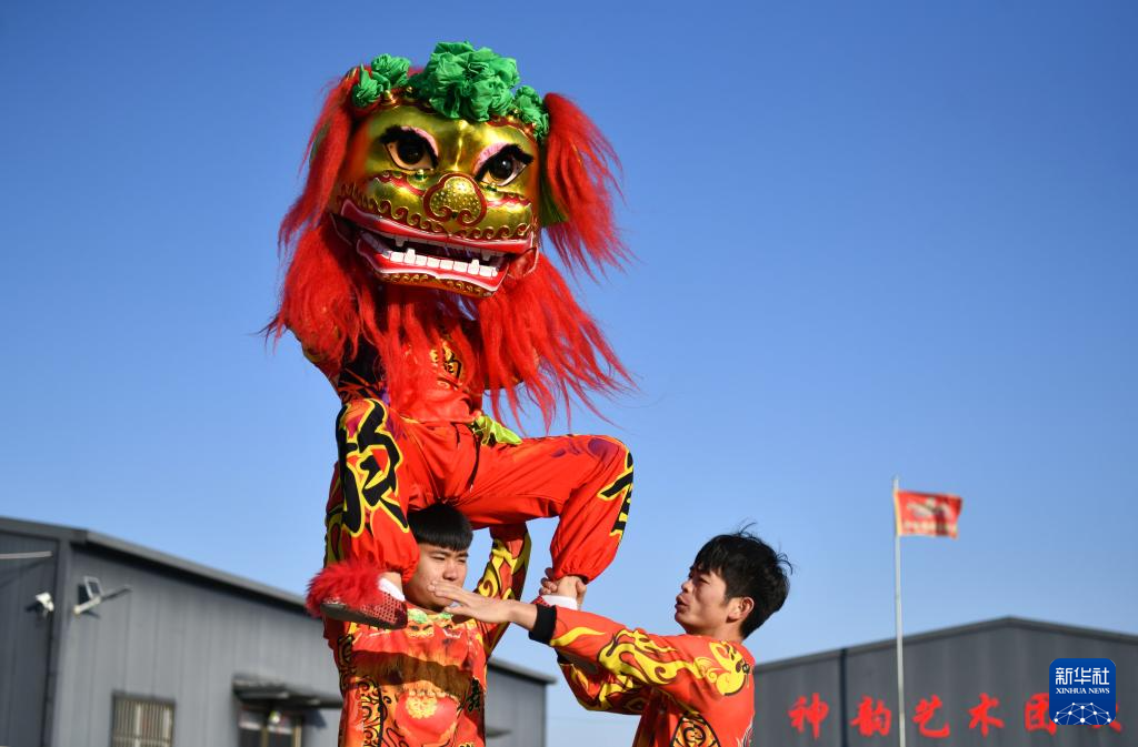 12月20日,河北省滄州市滄縣神韻舞獅傳承基地的學員在練習舞獅動作。