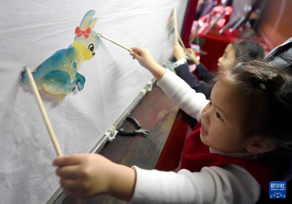 12月22日,一名小朋友在國家大劇院一層公共空間體驗皮影戲。