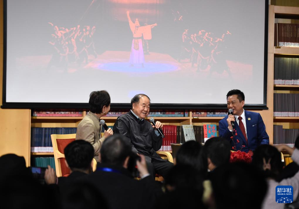 12月22日,作家莫言(中)和國家大劇院副院長王斑(右)在“從文字到舞臺——莫言戲劇作品分享會”上暢談。