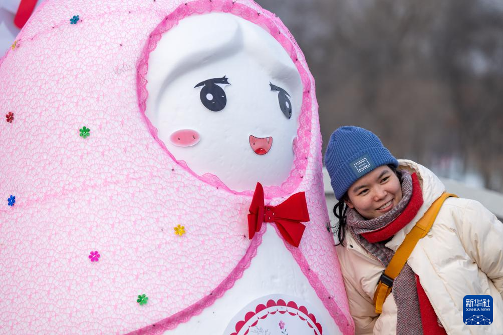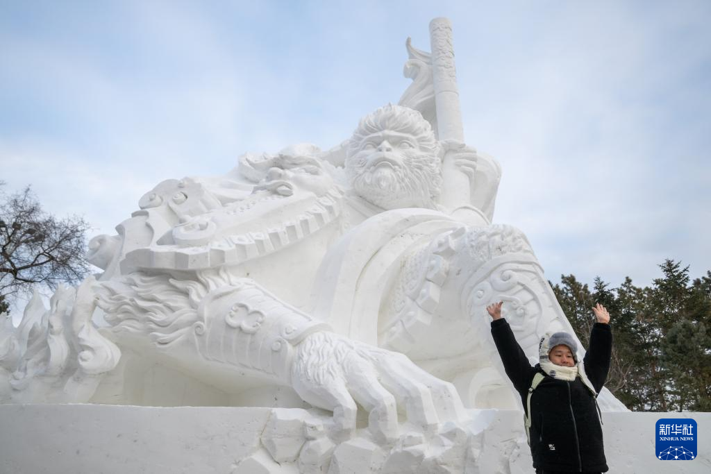 12月23日,一名游客在第37屆太陽島國際雪雕藝術博覽會上拍照留念。