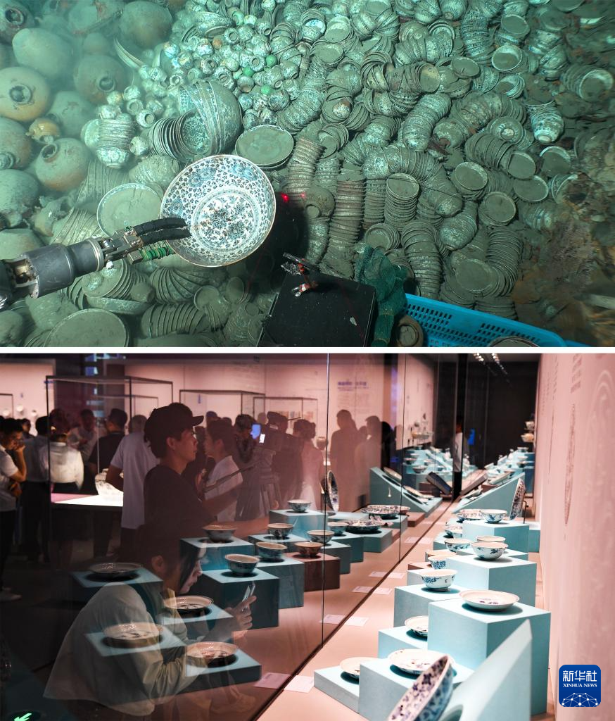 拼版照片:上圖為文物工作者使用深潛設備對南海西北陸坡沉船遺址水下文物進行提?。ㄙY料照片);下圖為2024年9月27日,觀眾在中國(海南)南海博物館舉行的“深藍寶藏——南海西北陸坡一二號沉船考古成果特展”上參觀、拍照(新華社記者楊冠宇攝)。兩處沉船遺址再現明代中期海上貿易的繁盛景象,是我國古代海上絲綢之路貿易往來的重要見證,為中國航海史、海洋貿易史和中外文化交流等研究提供重要的實物資料。