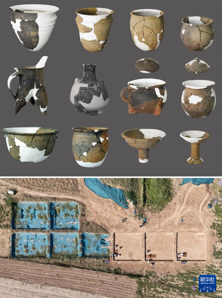 拼版照片:上圖為八里橋遺址出土的陶器(河南省文物考古研究院供圖);下圖為2024年9月11日拍攝的位于河南省南陽市方城縣的八里橋遺址發掘現場(無人機照片,新華社記者袁月明攝)。八里橋遺址是豫南地區已發現規模最大、等級最高的二里頭文化聚落,為探索夏文化地方城邑聚落形態、社會結構提供了新線索,是夏文化考古工作的重要突破。