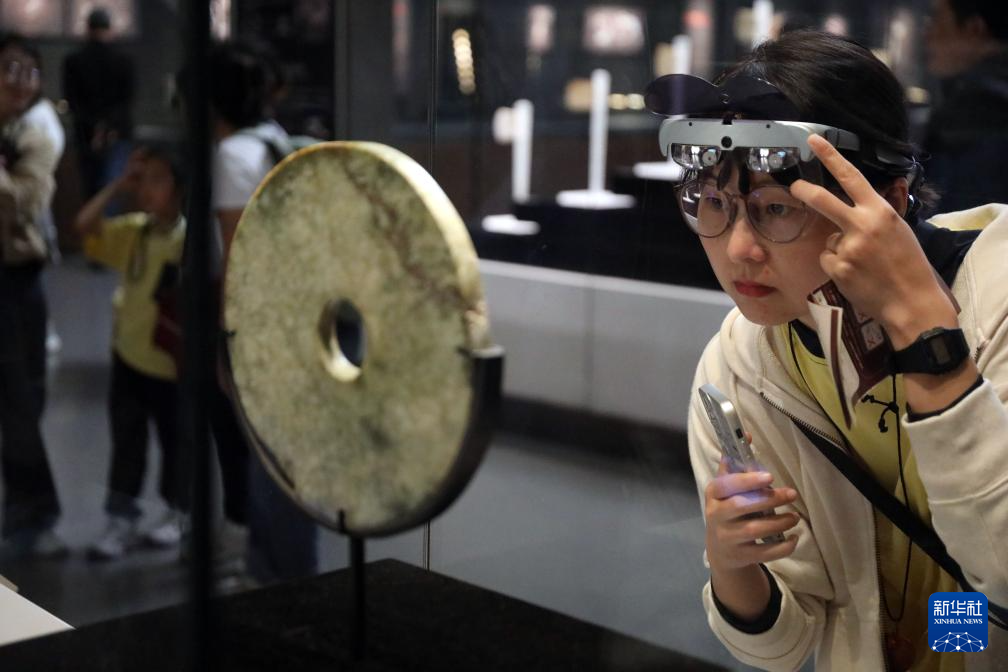 2024年10月5日,游人在位于浙江省杭州市余杭區的良渚博物院觀賞展品。