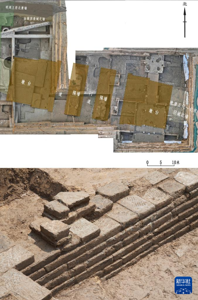 拼版照片:上圖為河南省開封市北宋東京城景龍門遺址示意圖(開封市文物考古研究院供圖);下圖為2024年6月18日拍攝的河南省開封市北宋東京城景龍門遺址的墩臺包磚(新華社記者袁月明攝)。北宋東京城景龍門遺址是目前考古發現北宋時期規模最大、規格最高的都城城門遺址。