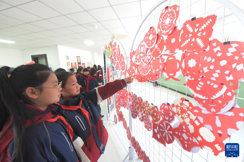 12月26日,河北省石家莊新樂市新華路小學學生在觀看“慶元旦·迎新年”學生書畫美術作品展覽。