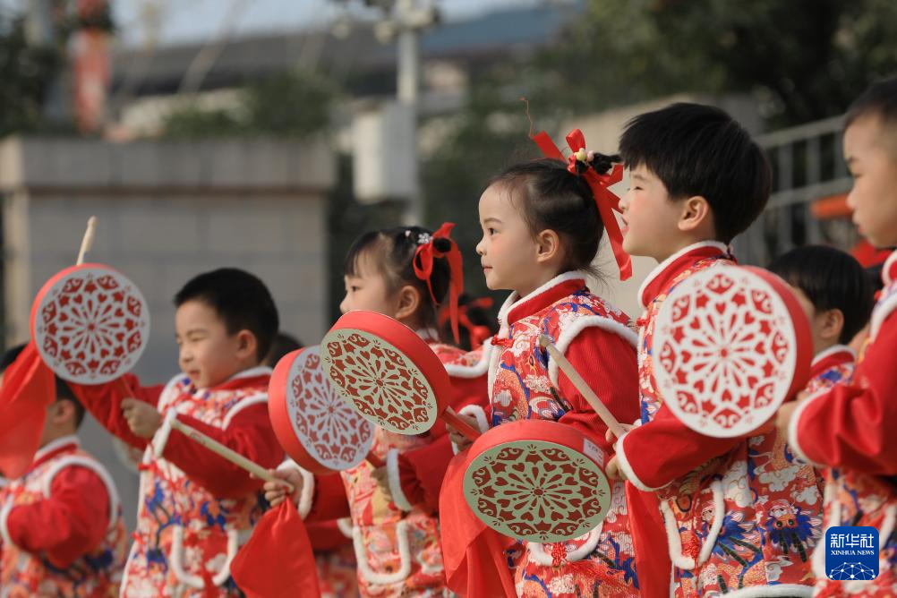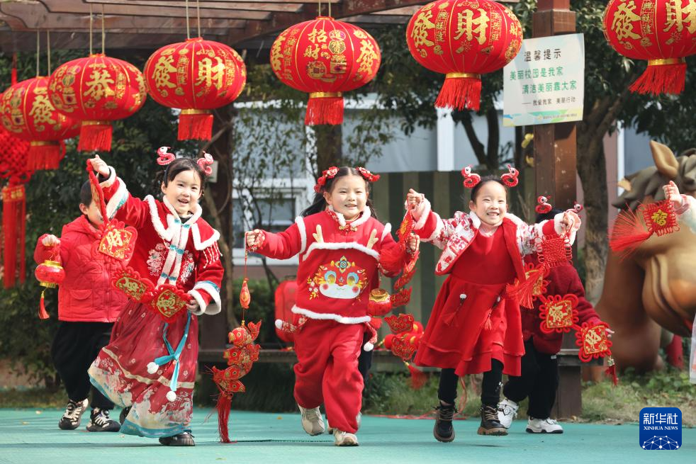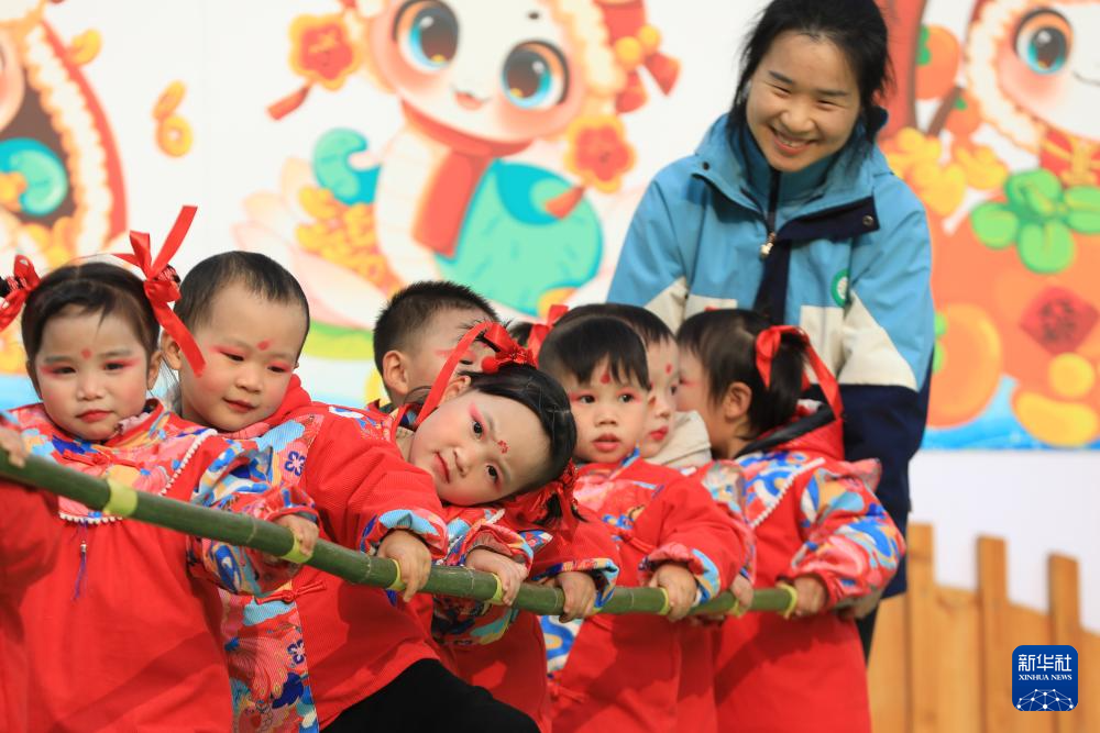 12月26日,在浙江省湖州市德清縣中心幼兒園,孩子們參加傳統民俗活動。
