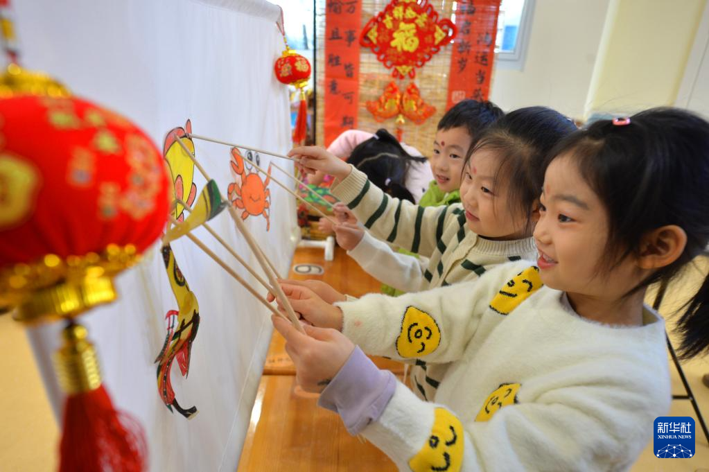 12月26日,在山東省青島市市北區第七實驗幼兒園,小朋友們在表演皮影戲。