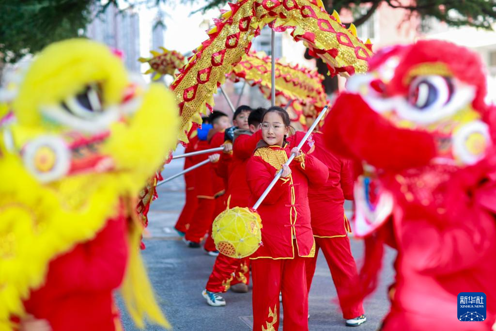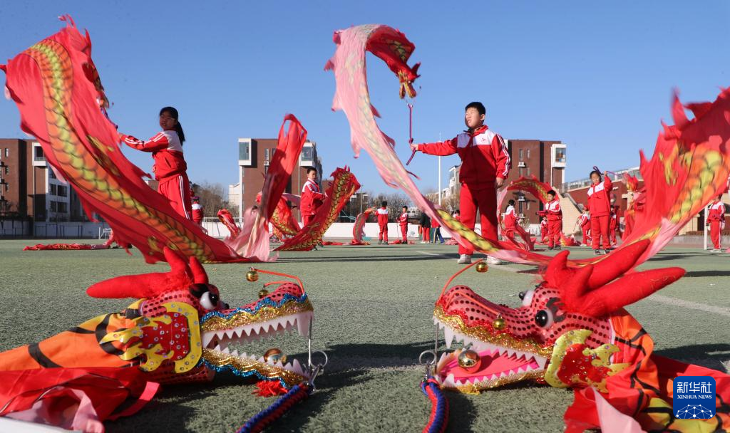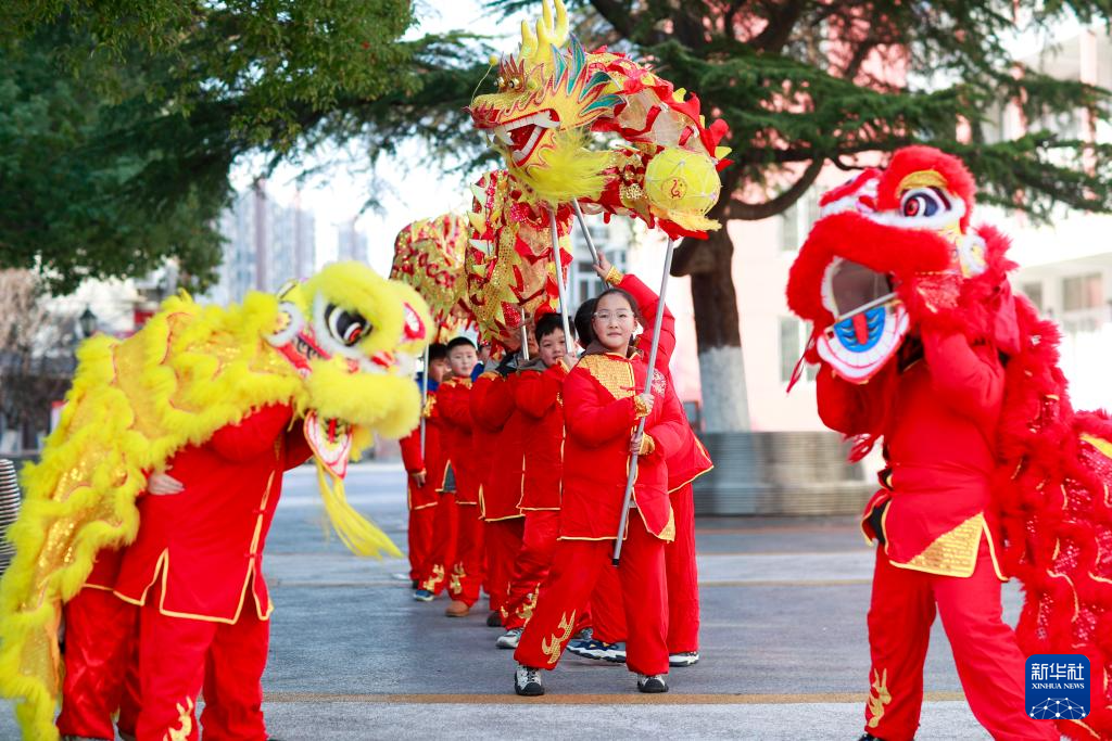 12月26日,山東省東營市勝利實驗小學小石榴舞龍社團學生舞動彩帶龍。