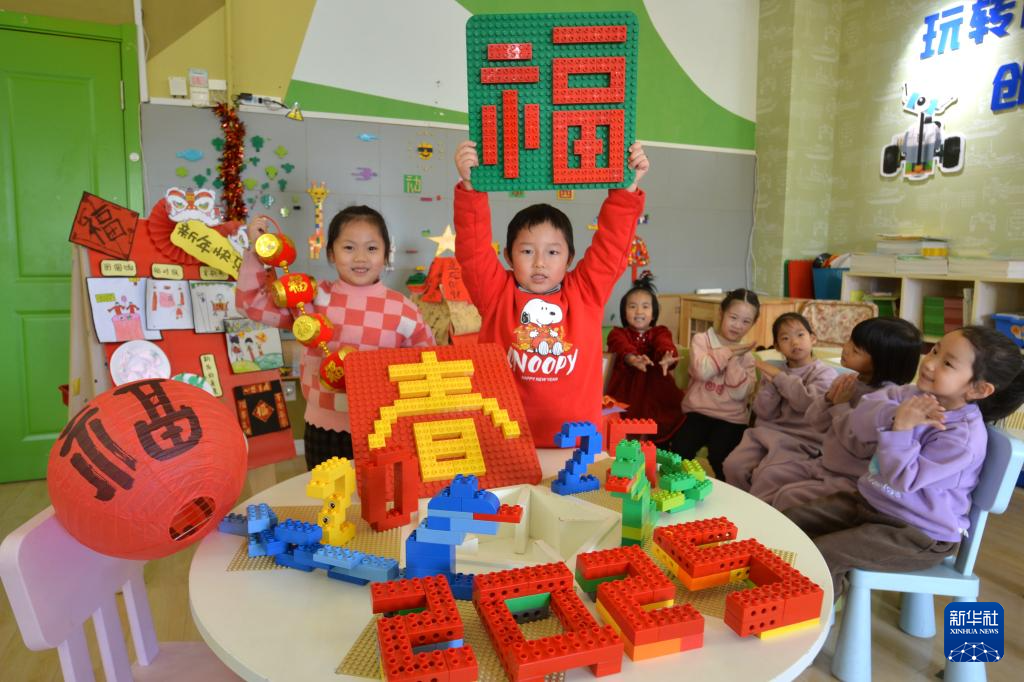 12月26日,在山東省青島市市北區海安幼兒園,小朋友們用樂高積木拼出2025新年祝福。