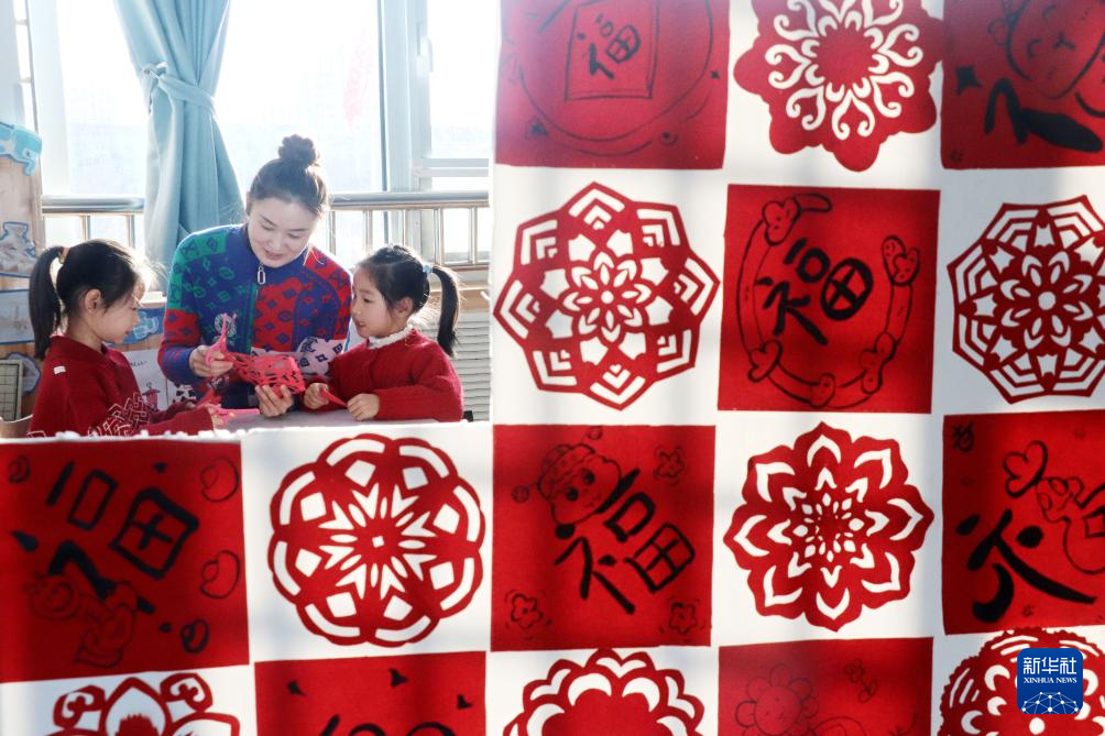 12月26日,在山東省高密市鳳鳴實驗幼兒園舉行的“學非遺 迎新年”活動中,老師與孩子們一起剪窗花裝飾教室。