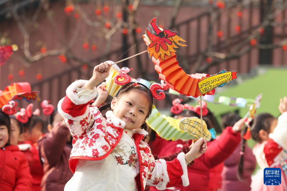 12月26日,在浙江省湖州市德清縣中心幼兒園,孩子舞龍迎新年。