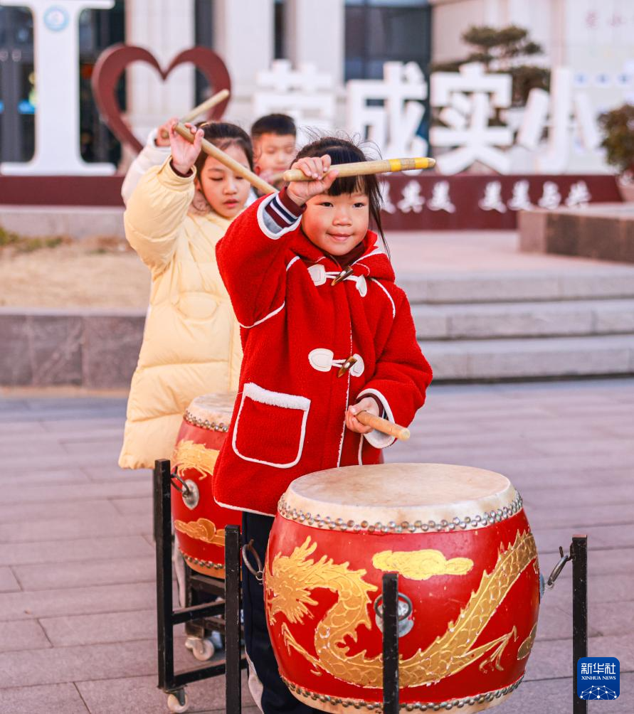 12月26日,在山東省榮成市實驗小學校園內,孩子們練習漁家鑼鼓,為迎新年文藝匯演做準備。