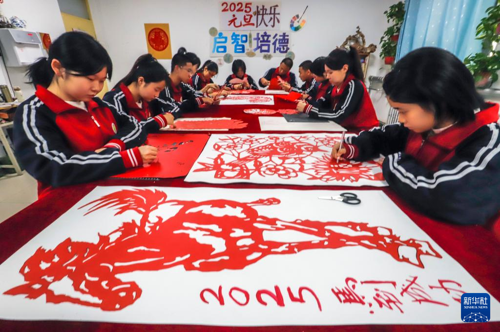 12月26日,河北省遵化市第一中學的學生在參加迎新年剪紙創作活動。