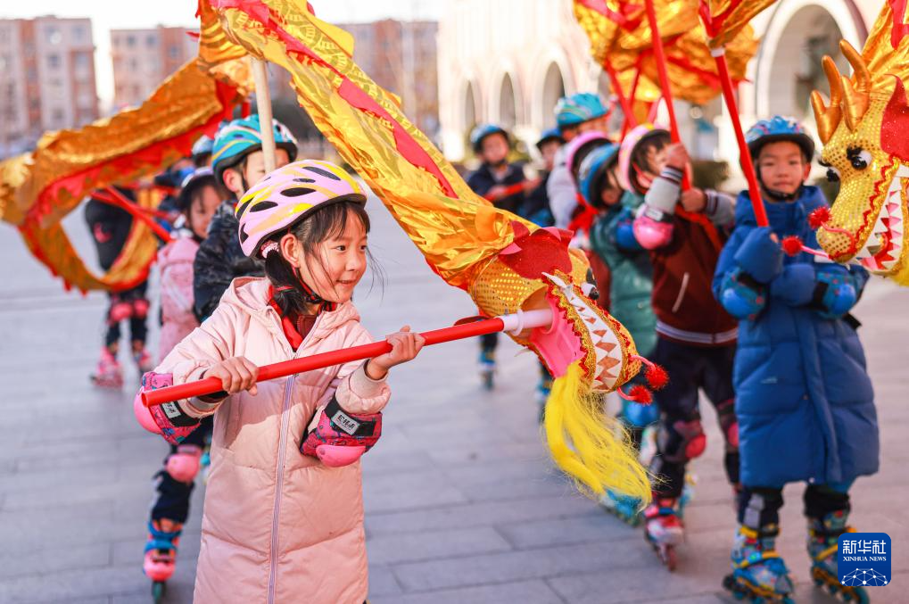 12月26日,在山東省榮成市實驗小學校園內,孩子們練習輪滑舞龍,為迎新年文藝匯演做準備。